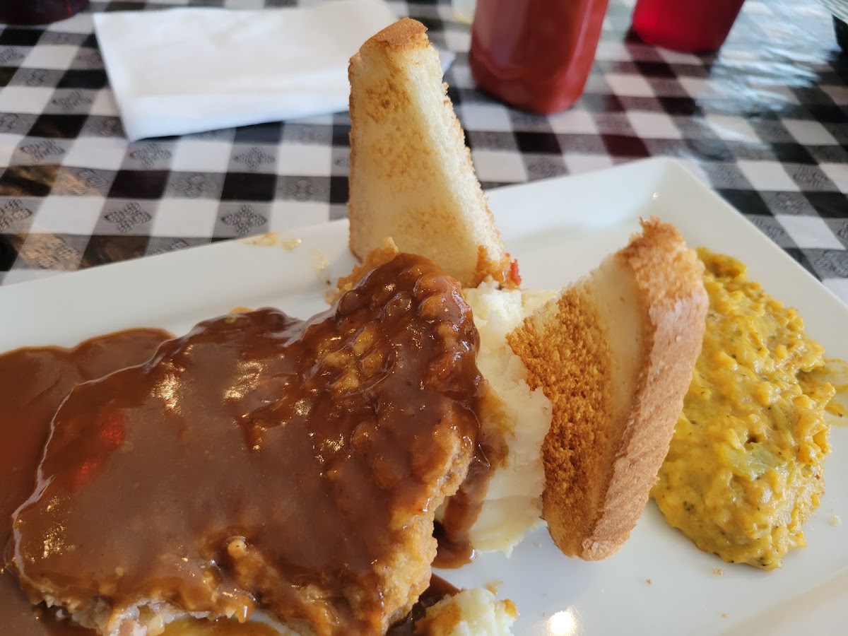 Cute diner in a small town. Service was fast & very friendly. We ordered the special of Country Fried Steak with gravy, 2 sides & a drink. We ordered the white gravy. It was delicious. The steak was fried crispy & the gravy was nice & thick as white gravy should be. My sides were macaroni & cheese and butter beans. My husband got mashed potatoes & butter beans. I didn't care for the butter beans. They were a bit peppery & the consistency was like a refried bean. It was not what I expected. But my hubby liked them. We both drank sweet tea. The tea was good. Not too sweet. For dessert, we got chocolate cake & red velvet cake. Chocolate was wonderful. The r3d velvet was too dry. The meal price was amazing. $40 with the tip. We would eat here again if we come back to the area.