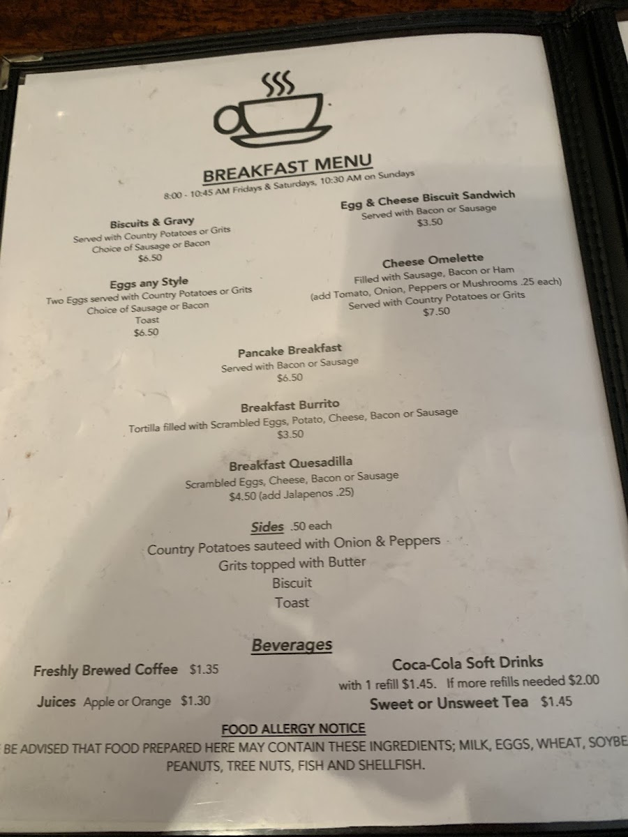 The menu includes hearty sandwiches like the Hamburger All the Way and the Philly Steak Sandwich, alongside filling entrees such as BBQ Ribs, Ribeye Steak, and Country Fried Steak served with traditional sides. Breakfast options are simple and satisfying, from fluffy pancakes and omelettes to biscuits and gravy, making it a great spot to start the day in a warm, unhurried atmosphere.